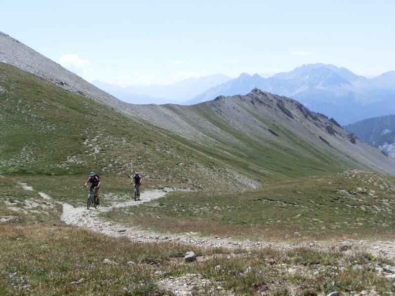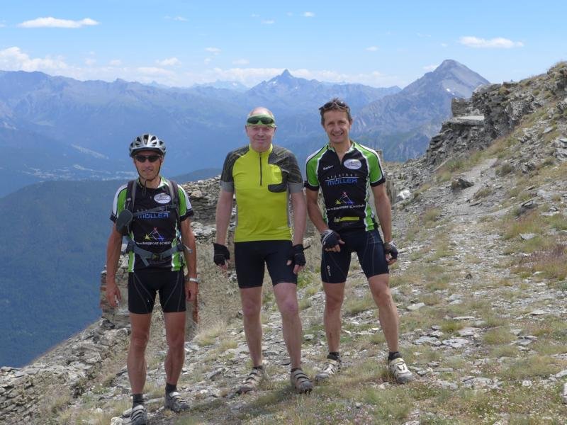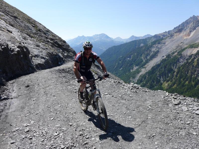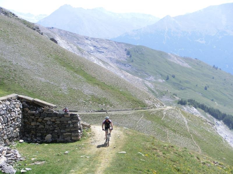 Die Tour am Anreisetag führte uns zum Passo de la Mulatierra. Wunderschöne, auf langen Strecken einsame Tour, fast durchweg auf gut erhaltenen Dynamite Trails. 1100 Meter über dem Talkessel des Alta Valle Susa schmiegen sich verfallene Unterkünfte, Stellungen und leere Munitionsdepots an die steilsten Felsen des Grenzkammes zwischen Italien und Frankreich. Für den Nordalpenbiker gab es ein überraschendes „Adriaflair“ an der Alpe Chesal zu erleben. Liegestühle, in denen sich sonnengebräunte Südeuropäerinnen extrem knapp bekleidet von der Sonne kitzeln ließen und Longdrinks genossen.