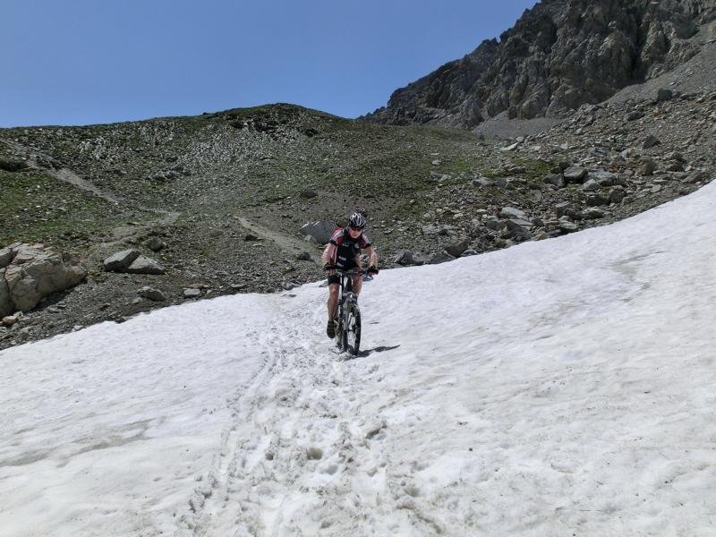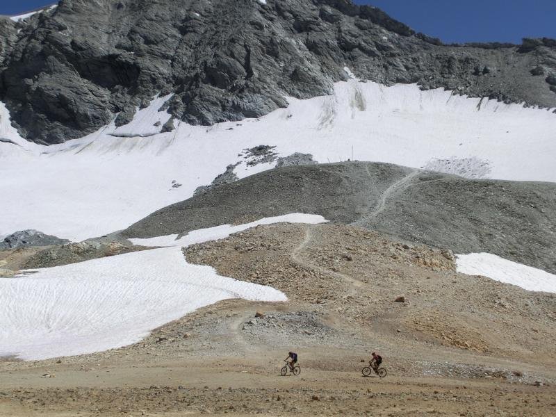 Mit der vierten Tagestour knackten wir die magische 3000 Meter Grenze hoch zum Colle Sommeiller. Von Bardonecchia aus mussten am Stück 1900 hm absolviert werden. Anfangs steil bergauf, dann über die Trasse einer historischen Schmalspurbahn durch das wunderschöne Rochemollers-Tal immer weiter bis zum Colle Sommeiler auf 3003 Meter. Die Superlative: komplett fahrbare Piste bis über 3000 Meter! Anschließender nicht endender Trail am Westufer des Lago di Rochemolles zurück ins Tal.