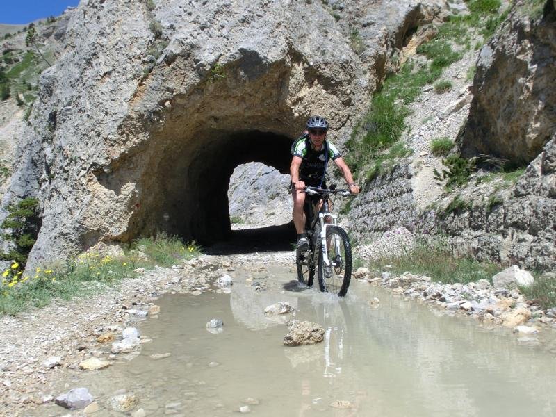 Die dritte Etappe war ein kleines Abenteuer zum Mont Jafferau. Eine alte Militärstraße zieht an eindrucksvollen Fortanlagen vorbei bergan. Diese spektakuläre Route verdanken die Biker den zurückliegenden kriegerischen Auseinandersetzungen, die ein gigantisches Netz von alpinen Militärstraßen hinterließen. Atemberaubend die Felslandschaft nahe dem Tunnel „Galleria die Saraceni“. Nach der abenteuerlichen Durchfahrt mit Lampen durch die eiskalte, dunkle, feuchte, 840 m lange Höhle eröffnet sich ein gigantisches Panorama. Danach folgte eine fast 1500 hm Traum-Singeltrail-Abfahrt nach Bardonecchia zum Eis schlecken – Wir waren uns schnell darüber einig, dass dies das längste zusammenhängende Trail war, den wir bisher erleben durften.
